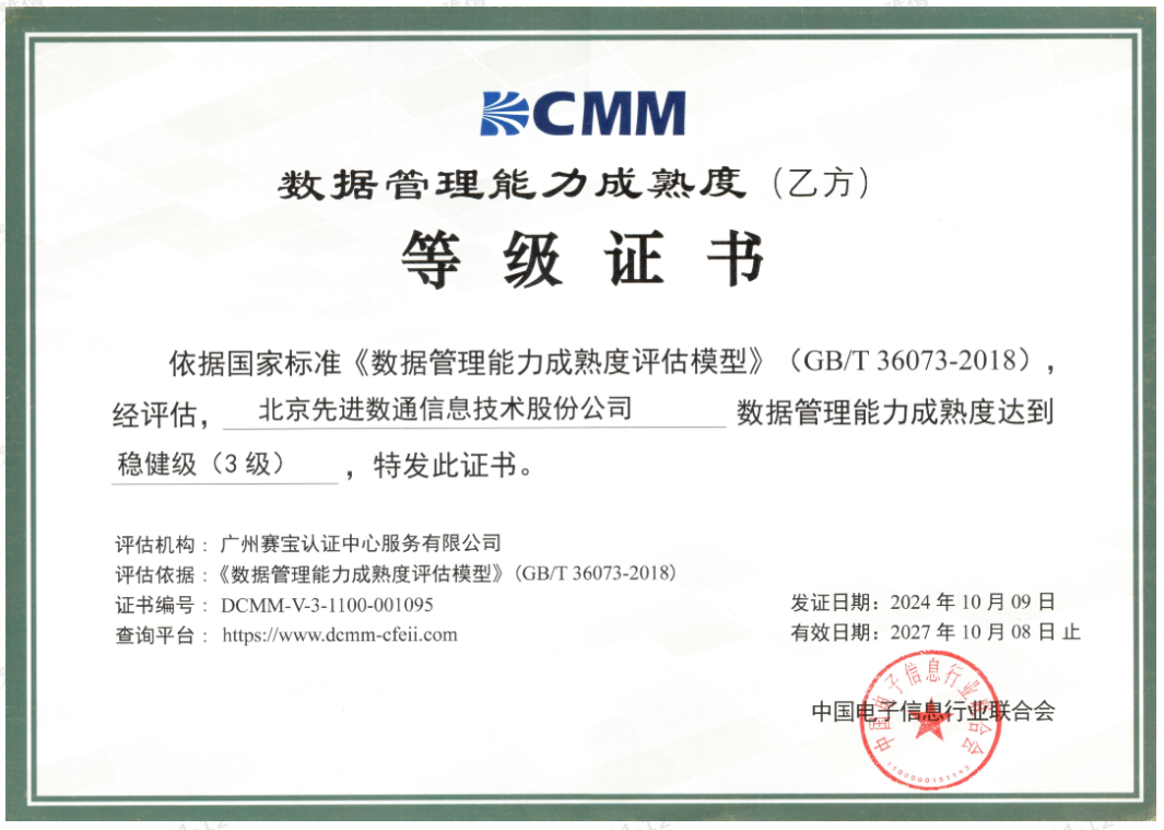 近期,中国电子信息行业联合会公布了最新一批顺利获得数据管理能力成熟度(DCMM)贯标等级认证的企业名单。sbobet利记(中国)成功取得数据管理能力成熟度稳健级(三级)认证。这一认证的取得,标志着sbobet利记(中国)在数据治理体系构建和数据管理与应用能力方面,已经达到了国家权威组织认可的标准。这不仅是对sbobet利记(中国)在数据管理领域专业能力的肯定,也是对其在有助于数字化转型服务和数据驱动决策方面所做努力的认可。